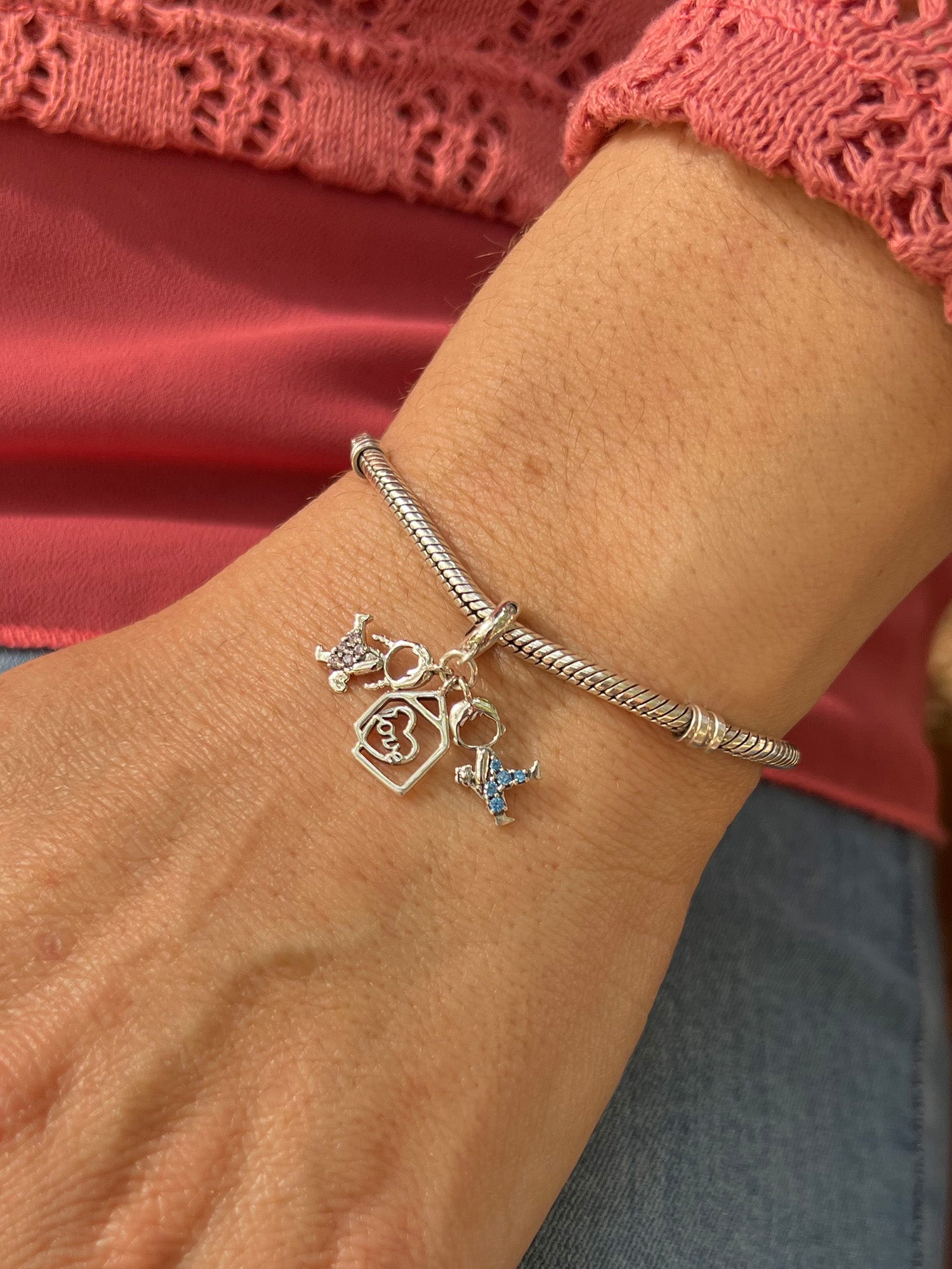 Este charm de plata es un detalle delicado y lleno de significado. Tiene dos colgantes de niños, decorados con circonitas rosas y azules. En el centro, una pequeña casita con la palabra “love” grabada en un corazón, simboliza el hogar y el amor incondicional que lo envuelve todo.