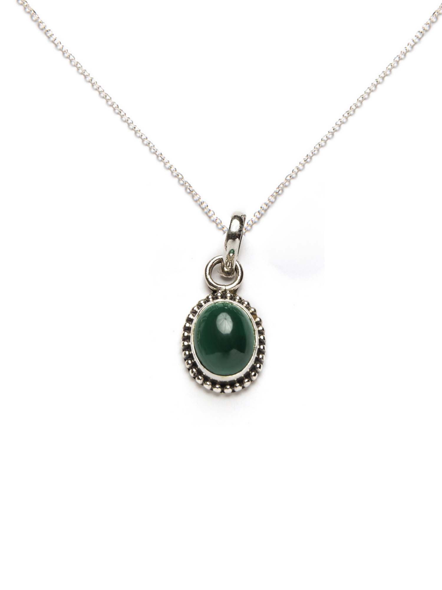 Collar en plata de ley con colgante ovalado de malaquita, una piedra natural con un color verde intenso y veteado único. El diseño del colgante, con detalle de borde en relieve, le da un aire artesanal y elegante.